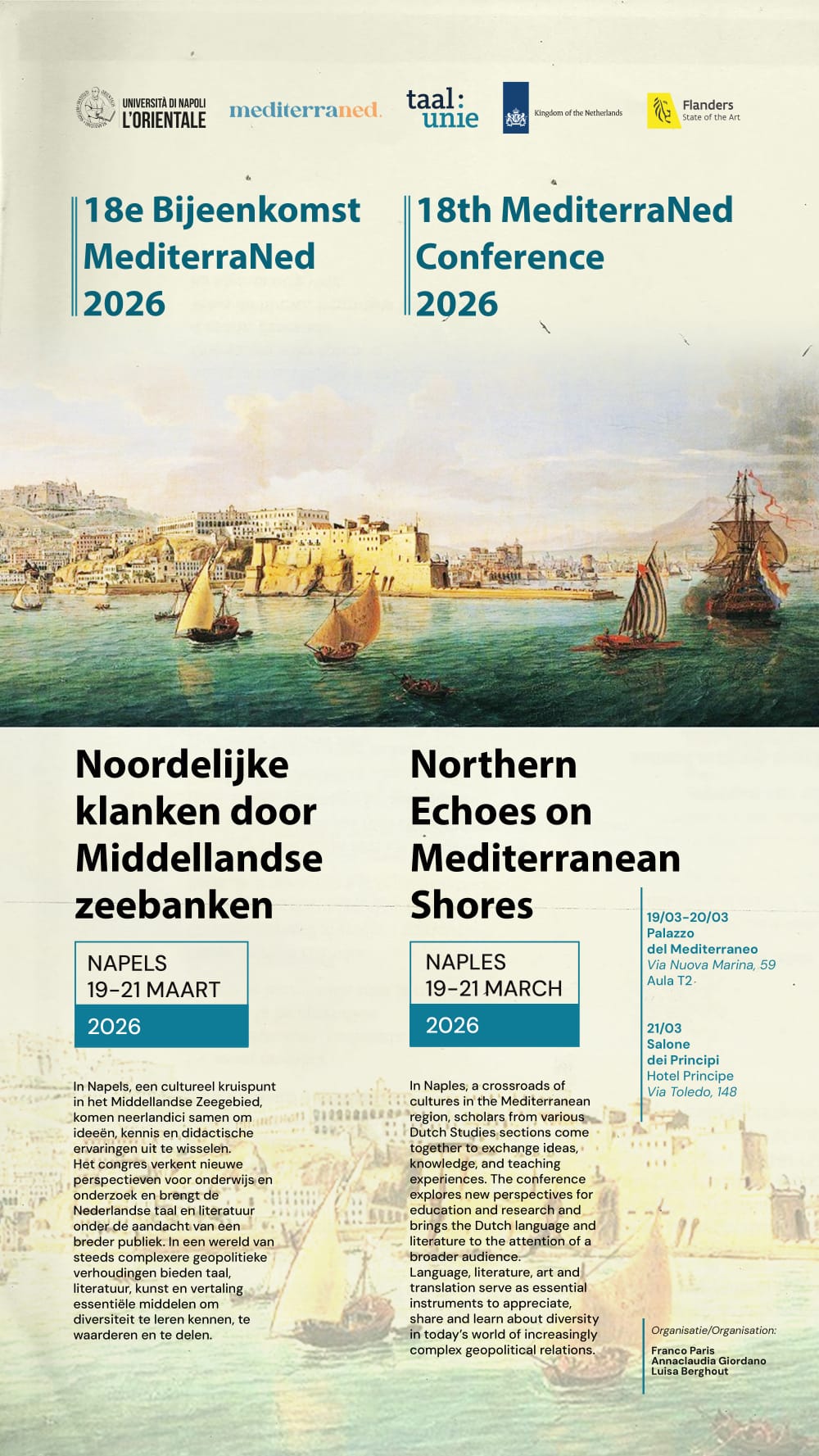 De bijeenkomst wordt gefinancierd door de Taalunie, met aanvullende steun van de Nederlandse Ambassade in Italië, van de Diplomatieke Vertegenwoordiging van Vlaanderen in Italië en van de Universiteit van Napels “L’Orientale”, die tevens als gastinstelling dient. De organisatie wordt verzorgd door Franco Paris, Annaclaudia Giordano en Luisa Berghout.