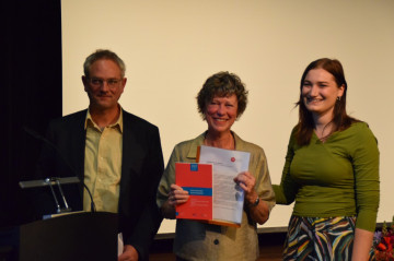 Anne: “Het mag duidelijk zijn dat Luts betrokkenheid bij de IVN groot was. Haar inbreng was steeds inhoudelijk, collegiaal en ambitieus. […] Voor al haar inzet voor de IVN, voor de neerlandistiek in Duitsland en voor de internationale neerlandistiek in het algemeen heeft het bestuur van de IVN onder leiding van Wim Vandenbussche besloten haar voor te dragen als erelid van onze vereniging. Op 27 augustus jongstleden heeft de Algemene Ledenvergadering van de IVN in Brussel bij acclamatie ingestemd met deze benoeming. Nog een ‘functie’ bij de IVN erbij, dus! Het mooie is dat je hier niets voor hoeft te doen.”
